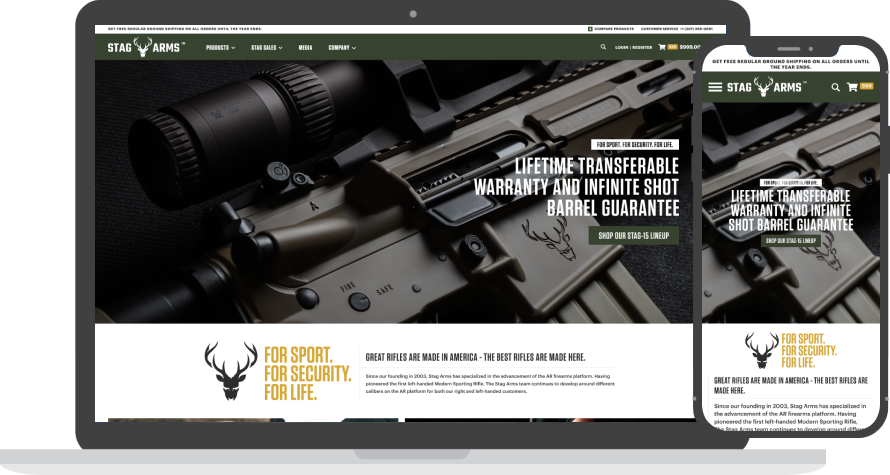 Stag Arms wanted to showcase new B2C and B2B websites with a better look and feel and take full advantage of new custom-focused features. Binary Anvil produced several unique features, extensions, and solutions that addressed the issues and complex processes such as the regulation of firearm shipments and customer identification management.